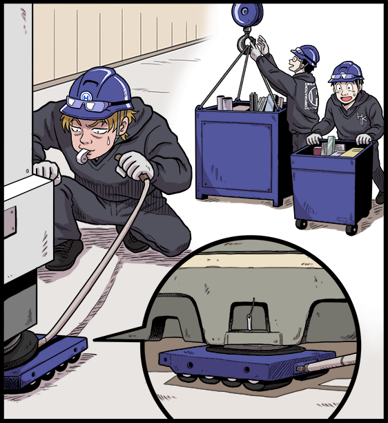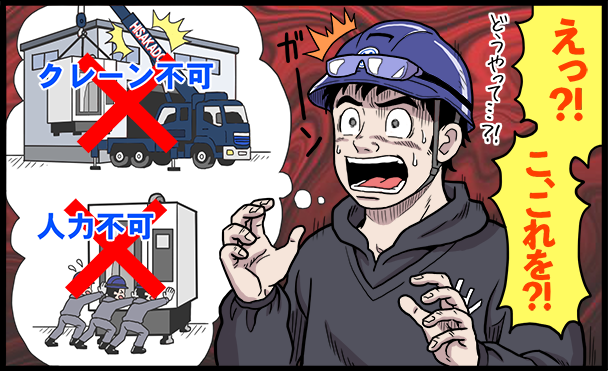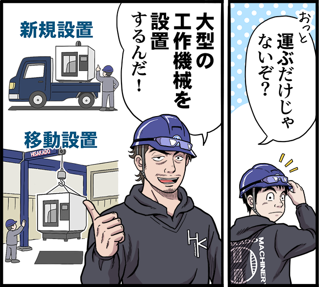 大きすぎて簡単には動かせない大型工作機械を、パーツを順に搬入して新規設置をしたり、工場内で分解して別の場所に運んで設置する仕事です。